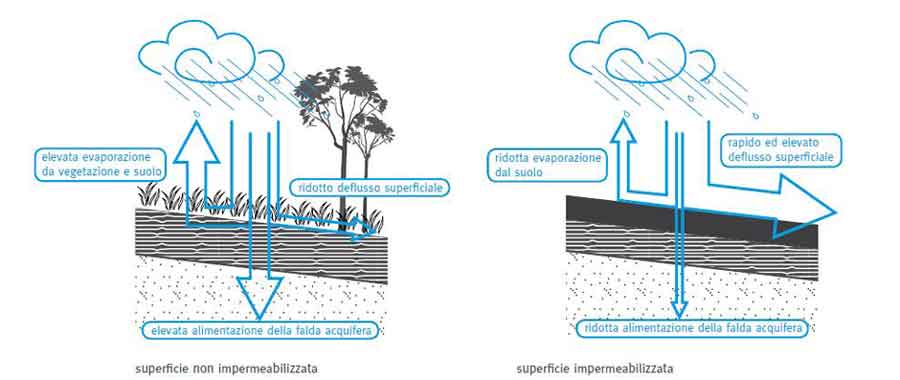 Lo schema seguente mette a confronto il ciclo dell’acqua nel caso di superfici non impermeabilizzate con quello di superfici impermeabilizzate.