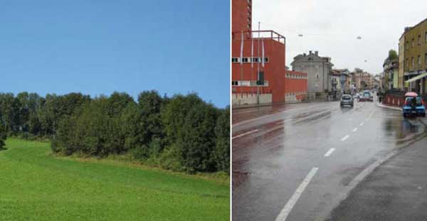 Nel caso invece di superfici impermeabilizzate, come ad es. tetti, pavimentazioni in asfalto o calcestruzzo, defluisce superficialmente oltre il 90% della pioggia. Rimane dunque un’aliquota minima d’evaporazione e d’alimentazione della falda. Si parla pertanto di un ciclo dell’acqua nelle aree impermeabilizzate.