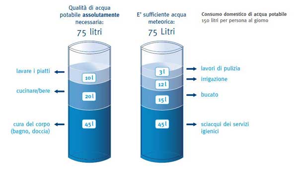 In Alto Adige il consumo giornaliero d’acqua potabile dei nuclei familiari è ca. pari a 150 litri per persona. Di questi ca. 45 litri sono consumati negli sciacquoni dei servizi igienici. Per la cura del corpo (bagno, doccia) si utilizzano ca. 45 litri. Per cucinare e bere servono ca. 20 litri. La lavatrice consuma ca. 15 litri. Per lavare le stoviglie il consumo d’acqua è di ca. 10 litri. Per l’irrigazione d’orti e giardini si può ipotizzare un consumo medio di ca. 12 litri, per lavori di pulizia servono ca. 3 litri. La raccolta e l’utilizzo dell’acqua meteorica consentono un risparmio d’acqua potabile pregiata. L’acqua meteorica è adatta soprattutto per innaffiare il verde e per gli sciacquoni dei servizi igienici. Inoltre è utilizzabile per la lavatrice, per la pulizia della casa o come acqua di raffreddamento. In questo modo sarebbe possibile utilizzare ca. 75 litri d’acqua meteorica per persona al giorno al posto d’altrettanta acqua potabile. Così si ha un risparmio d’acqua potabile che può raggiungere il 50%.