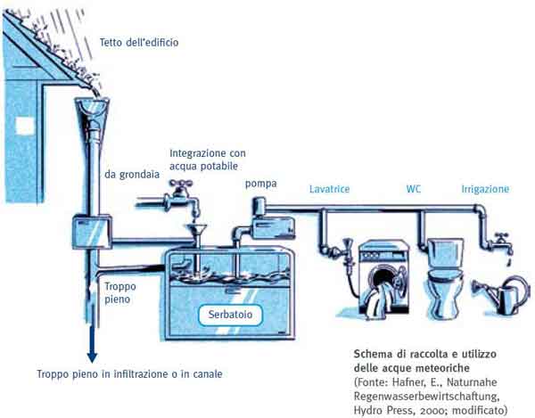Generalmente vengono raccolte solamente le acque dei tetti. Alcune tipologie di copertura non sono però del tutto idonee per la raccolta e l’utilizzo a scopo irriguo (ad es. coperture in rame, zinco o piombo, senza trattamenti protettivi). Per un recupero a basso costo può essere sufficiente un piccolo serbatoio per la raccolta delle acque meteoriche, ma quest’applicazione è limitata all’utilizzo a scopo irriguo a causa della mancanza di filtro e pompa. Ormai sul mercato molte ditte offrono una vasta gamma di sistemi modulari “chiavi in mano”. Un impianto d’utilizzo dell’acqua meteorica è costituito dai seguenti componenti base: