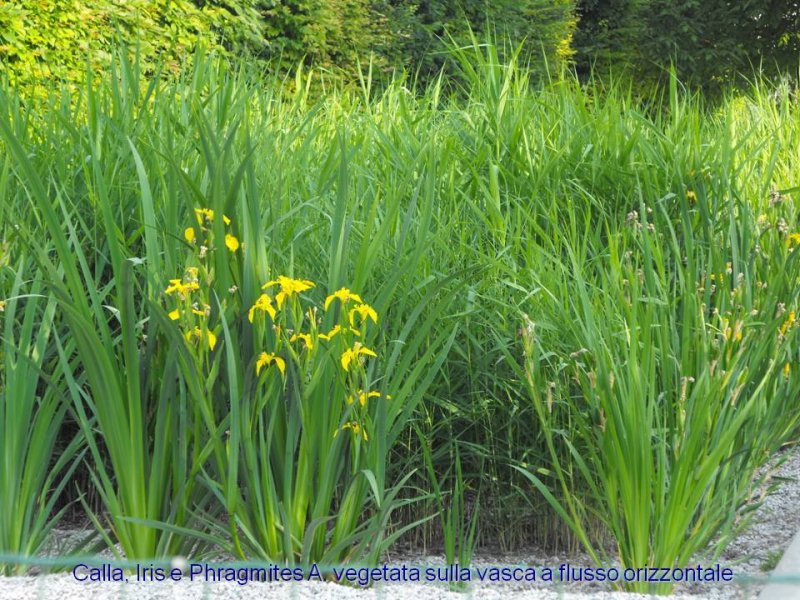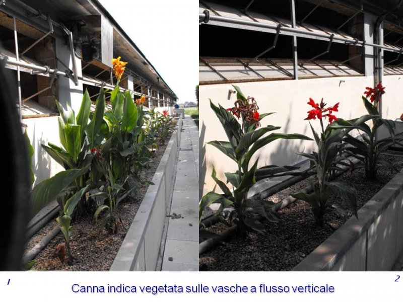 Vi è poi in progetto un’ulteriore sperimentazione riguardante la fitodepurazione a flusso verticale allo scopo di testare le capacità depurative rispetto all’abbattimento dell’azoto delle specie vegetali Consolida del Caucaso e Canna indica. Il refluo in uscita da queste vasche verrà comunque immesso nell’impianto principale a flusso orizzontale.