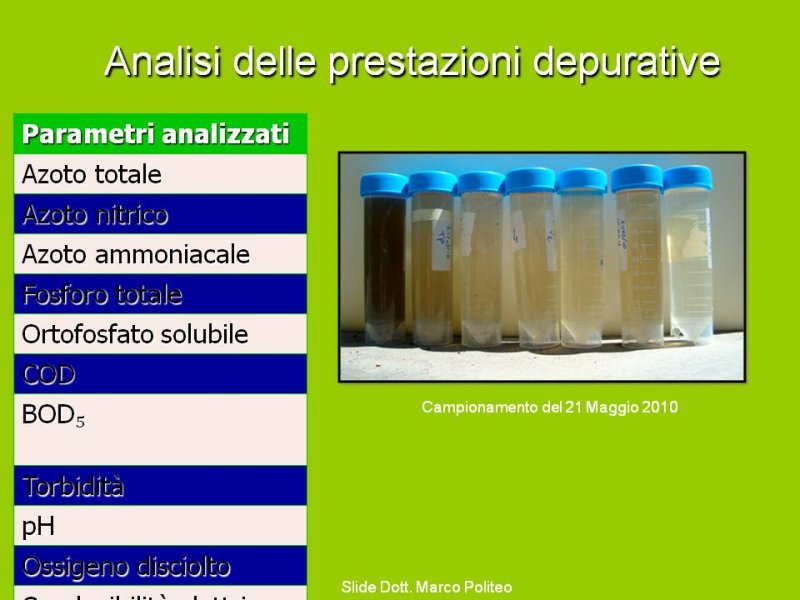 Le acque in uscita dagli impianti di fitodepurazione sono prive di elementi inquinanti nel rispetto delle norme italiane per lo scarico da impianti di trattamento e possono essere immesse, in un corso d’acqua superficiale.