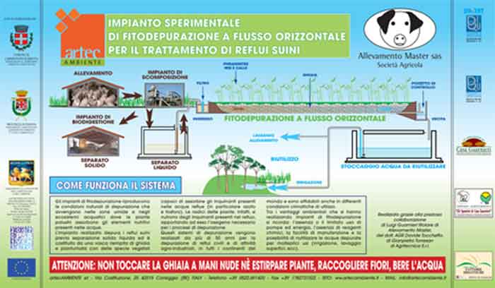Artecambiente srl ha progettato e realizzato, in collaborazione con l’Allevamento Master di Carmignano di Brenta, in Provincia di Padova, un impianto sperimentale, unico in Europa, per il trattamento mediante fitodepurazione dei reflui derivanti da un allevamento suinicolo.
