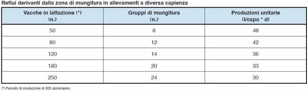 Nella tabella che segue si riportano i volumi di reflui normalmente prodotti in zona di mungitura.