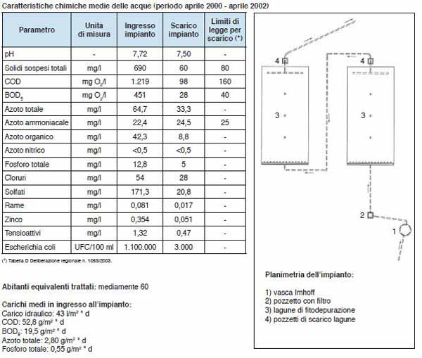 - dimensioni di 12,5x6x0,9 m, impermeabilizzazione con telo in PVC protetto da entrambe i lati con geotessuto, il primo letto con ghiaia diametro 8-12 mm, il secondo con ghiaia diametro 3-6 mm, vegetati con Phragmites Australis